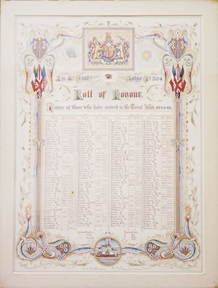 When the Great War commenced in 1914 many brethren were enlisted into the armed services, those that made the ultimate sacrifice are remembered on a memorial stone donated to the Lodge by Bro Col L G Pearson and Bro T W McIntyre in 1921. A Roll of Honour was also produced at that time to honour all those from the lodge who had given service during the War.