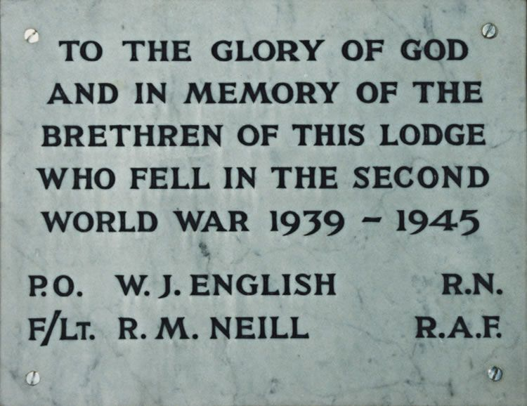 In February 1940, the death of Bro William English, Petty Officer, on active service with the Royal Navy is recorded in the minutes, it was also noted that he was one of the youngest Master Masons of the Lodge, and the first from this Lodge to be killed in this conflict. The only other being Bro R M Neill, Flight Lt, RAF, their names being recorded on a Memorial Stone in the old Lodge room.